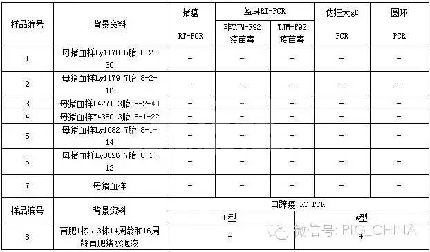 送检7头母猪血样和1份育肥猪混合水疱液,血样送检实验室进行猪瘟、蓝耳、圆环和伪狂犬病原检测,目的为制备高免血清,结果猪瘟、蓝耳、圆环和伪狂犬病原均为阴性;1份育肥猪混合水疱液口蹄疫RT-PCR分型检测O型和A型检测均为阳性。