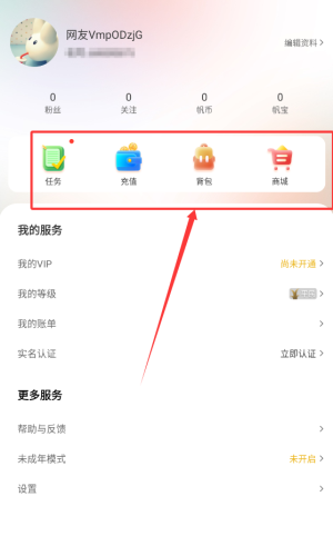 4、我的页面集中展示任务中心、充值入口、虚拟背包及内置商城功能。