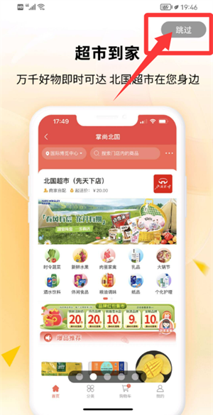 1、启动应用后点击跳过按钮,直接进入在线商城主页面。