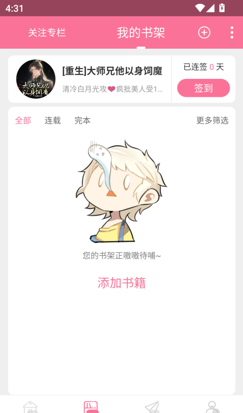 3、点击下方第三个模块“书架”进入,在里面可以进行签到,以及添加书籍。