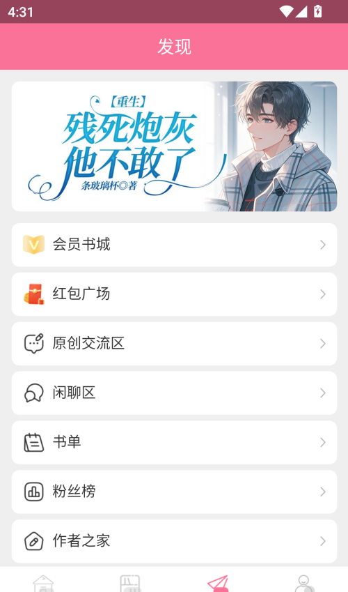 4、点击第四模块“发现”,在这里面可以加入交流社区,与众多用户交流互动,讨论小说情节。