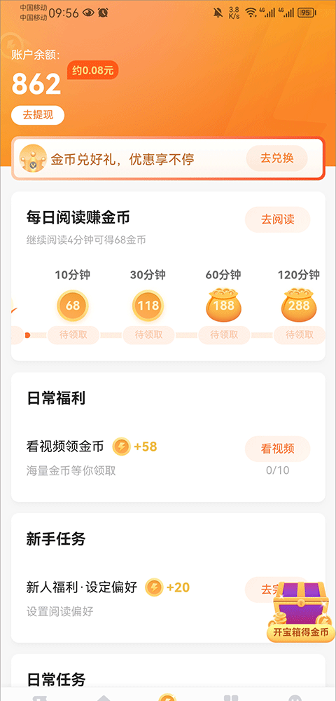 4、另外在福利界面中,阅读书籍后可以获得金币,当金币达到一元金额时就可以选择提现了。