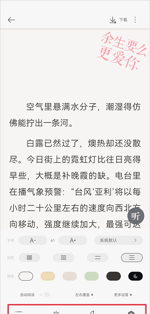3、然后就可以正常阅读内容啦,点击屏幕还可呼出菜单,你可以查看目录、调正亮度、切换日/夜间模式、设置自动阅读、字体等等。