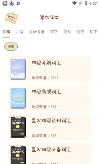 4、全面的词汇书覆盖:涵盖小学至GRE、雅思、托福、四六级、考研、专四专八等各个阶段的词汇库。根据需要选择。