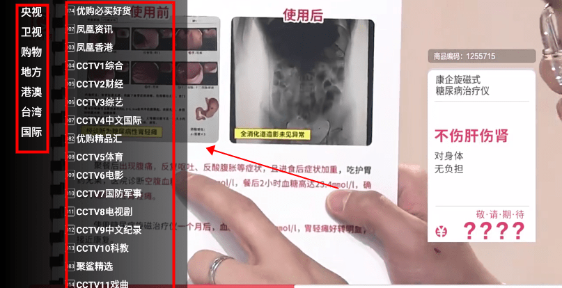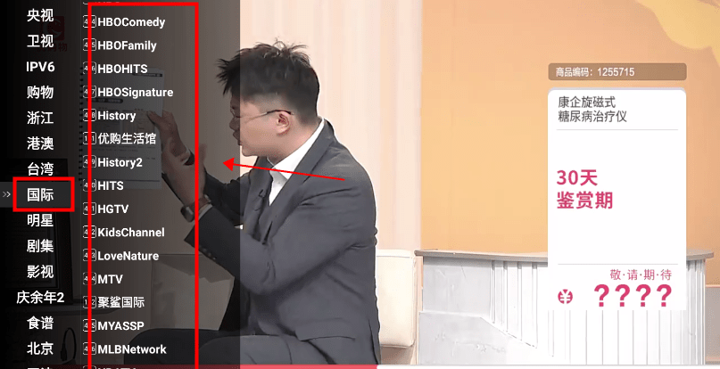2、遥控器点确定,就能出现切换频道界面,有央视、卫视、购物、地方、港澳、台湾、国际等多个板块。