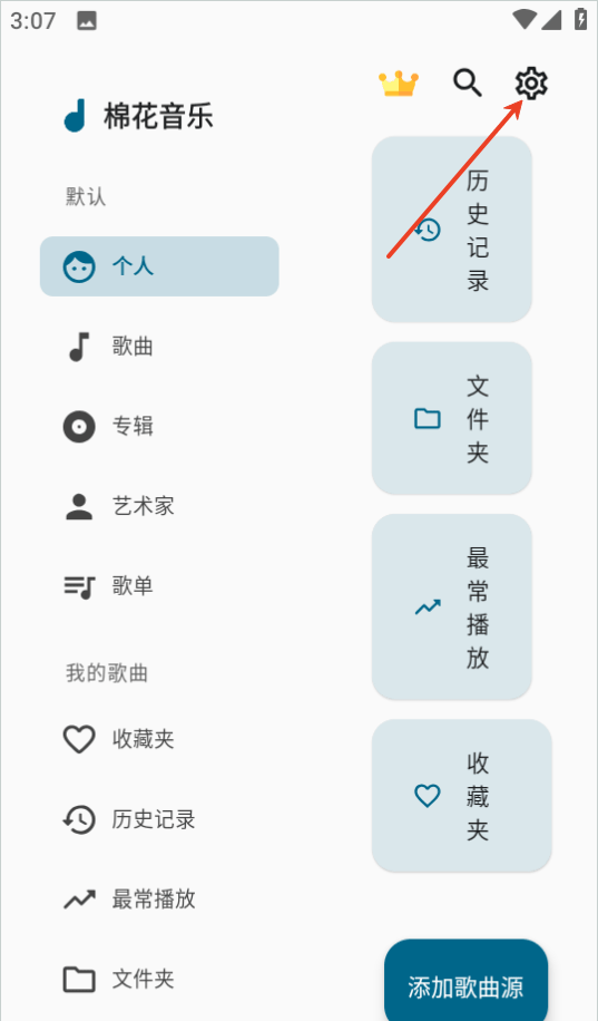 1、打开棉花音乐应用程序,点击右上角的设置图标。