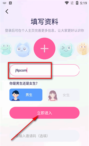 4、登录成功后,填写名称和性别就可以立即进入了。