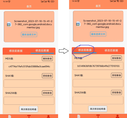 文件MD5修改器app是一款专门针对手机文件处理修改编辑的工具。可以直接从Android手机中选择视频等格式文件,然后先获取文件的md5码。之后,您可以进行修改。而且,这种修改可以分批进行。用户可以方便地操作各种格式的文件,包括修改文件的MD5值、SHA256值和SHA1值。此应用程序易于操作,使加密修改更容易。为用户的手机文件修改和处理带来了很多的便利。