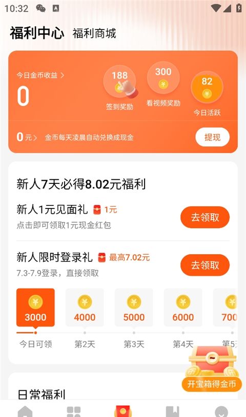 8、进入福利界面,完成签到、阅读、登录等任务后可以获得金币奖励,累积一定的金币后还可以进行提现,
