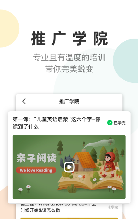 凯阅是一款极具价值意义的有关亲子阅读推广的软件,平台通过招募、孵化更多专业且有温度的阅读推广人,把高品质的亲子阅读产品和寓教于乐的亲子阅读方式带给每一个家庭,帮助中国家庭形成亲子阅读的理念与习惯。平台内开设推广学院,将会带领你从绘本知识到营销推广,构建你全方位的知识体系。平台为你提供“海报+短视频+图文”推广素材,每天只需动动手指,素材一键分享朋友圈。