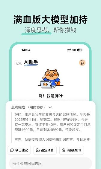 2、智能预算提醒:基于历史消费数据,AI自动生成月度预算,并在超支时实时提醒,助力理性消费。