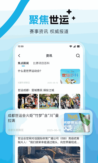 世运通是一款专为成都世界运动会打造的赛事资讯软件,软件中将各种赛事资讯进行了权威报道,用户可以轻松掌握权威报道的各种世运赛事资讯信息,此外,软件中还推送有旅游、美食、娱乐、文化等多方面的信息可供用户查看,为你提供成都指南,让你可以将成都的各种资讯信息一手掌握,可以根据个人喜好需求选择资讯频道查看相关的资讯动态信息,让用户可以将各种资讯信息一手掌握。
