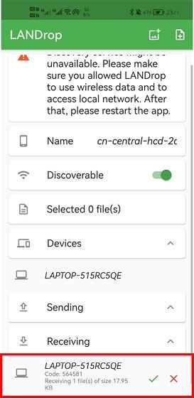 3、之后手机的软件界面会在【Receiving】栏弹出一个电脑发来的握手标志,点击“√”,电脑就会自动将文件传输至手机上。