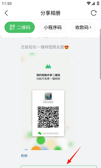 2、在分享相册页面将您的二维码展示给他人扫码即可分享相册,也可以点击下方的一键转发。