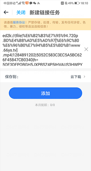 4、这里输入的是电驴链接,输入完成后选择保存位置,然后点击【添加】即可开启下载。