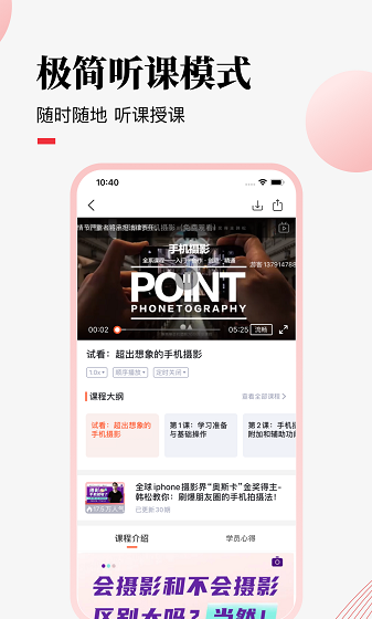 3、界面简洁,体验极佳:操作流畅,分类清晰。即使是初学者也能很快找到他们需要的课程,并专注于学习,而不会受到广告的干扰。