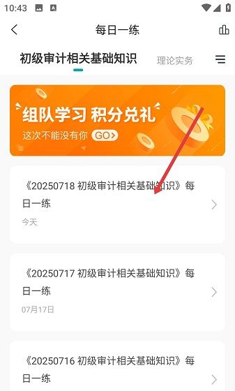 2、用户可参与组队学习积分兑礼活动,页面展示了不同日期的初级审计相关基础知识练习题目,方便用户按日期进行练习。