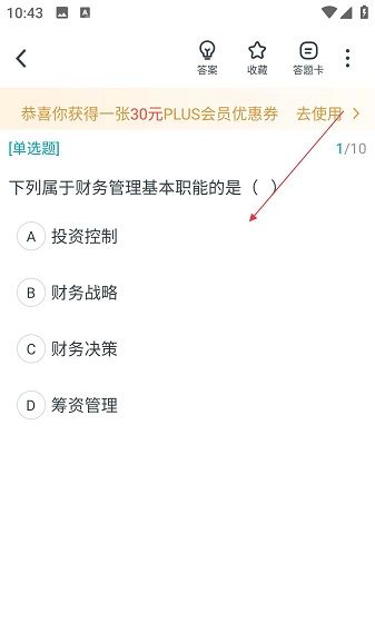 3、练习题目界面呈现了财务管理基本职能相关的单选题,用户可作答,同时还能查看答案、收藏题目或使用答题卡。