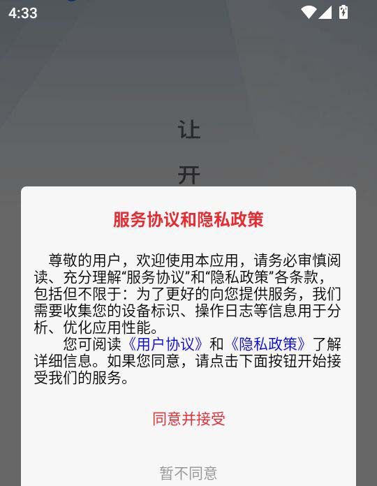 1、首先打开软件阅读协议和隐私政策后,点击“同意并接受”按钮进入APP。