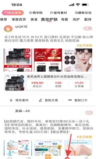3、发现页展示美妆护肤类商品推荐,含券后价与券额信息,提供素材保存文案复制功能,是商品推广的素材页。
