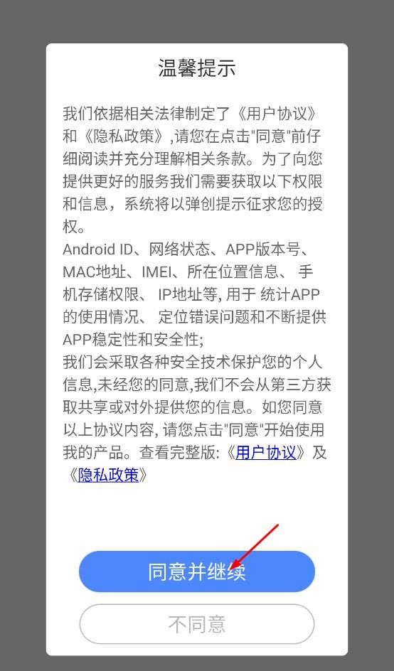 1、打开滚动提词器应用,在温馨提示弹窗中,点击同意并继续按钮,进入主界面。