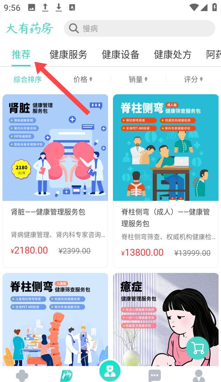 2、在大有医网页面上,展示了肾脏健康管理、脊柱侧凸筛查等服务包,包括专家咨询、健康检查等。标出价格和折扣,并提供疾病管理的定制选项。