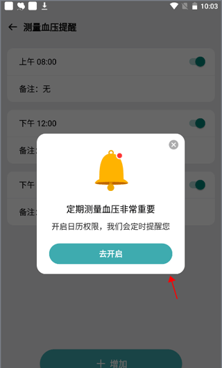 2、此时,将弹出一个小窗口。启用日历权限,让日历自动提醒我们测量血压。只要点击“去开启”就可以了。