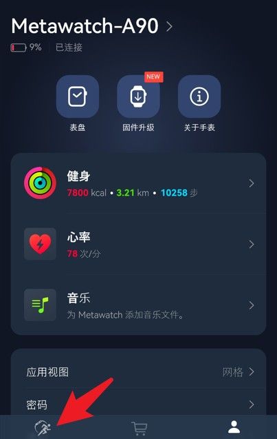 2、在首页,您可以查看手表的连接状态、电池电量和多项数据。您还可以进入表盘,固件和设备信息管理页面。