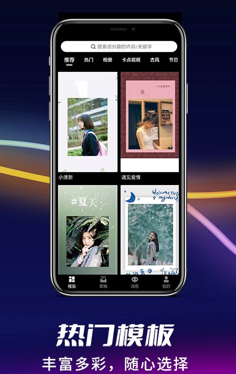2、【编辑模板】选择背景音乐,贴纸,添加文字,创作属于自己的美丽。
