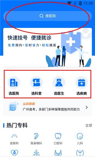 3、然后在主页上搜索医院,或直接选择医院、科室、医生,或选择疾病。
