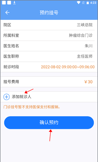 6、最后,添加需要注册的患者,点击“确认预约”。