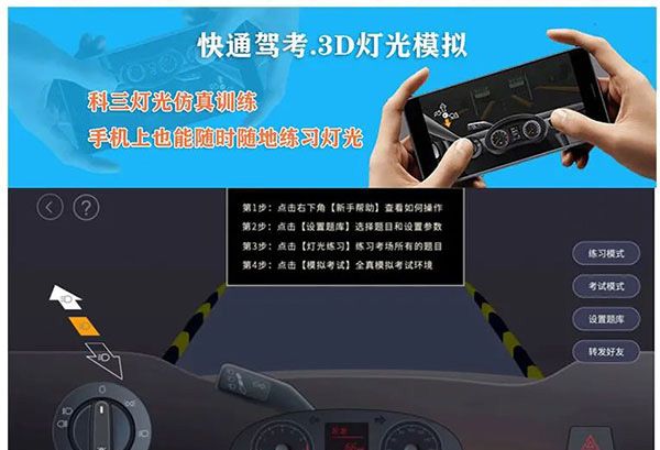 5、快速驾驶测试3D灯光模拟,柯三灯光模拟训练,以及随时随地在手机上练习灯光的能力。