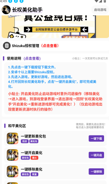 长叹美化助手app是一款免费好用的游戏美化包软件。可以随时开启和移除,支持各种美化效果,如枪支、服装、车辆等,而且网络上流行的美化包也可以直接使用。有了它,游戏界面、角色、服装等内容都可以一键美化,完全免费,给你带来极佳的视觉体验,当然,美化后的操作也非常流畅。无需复杂的操作,只需一键就可以快速激活各种游戏美化效果,简单高效地设置,瞬间刷新视觉体验。