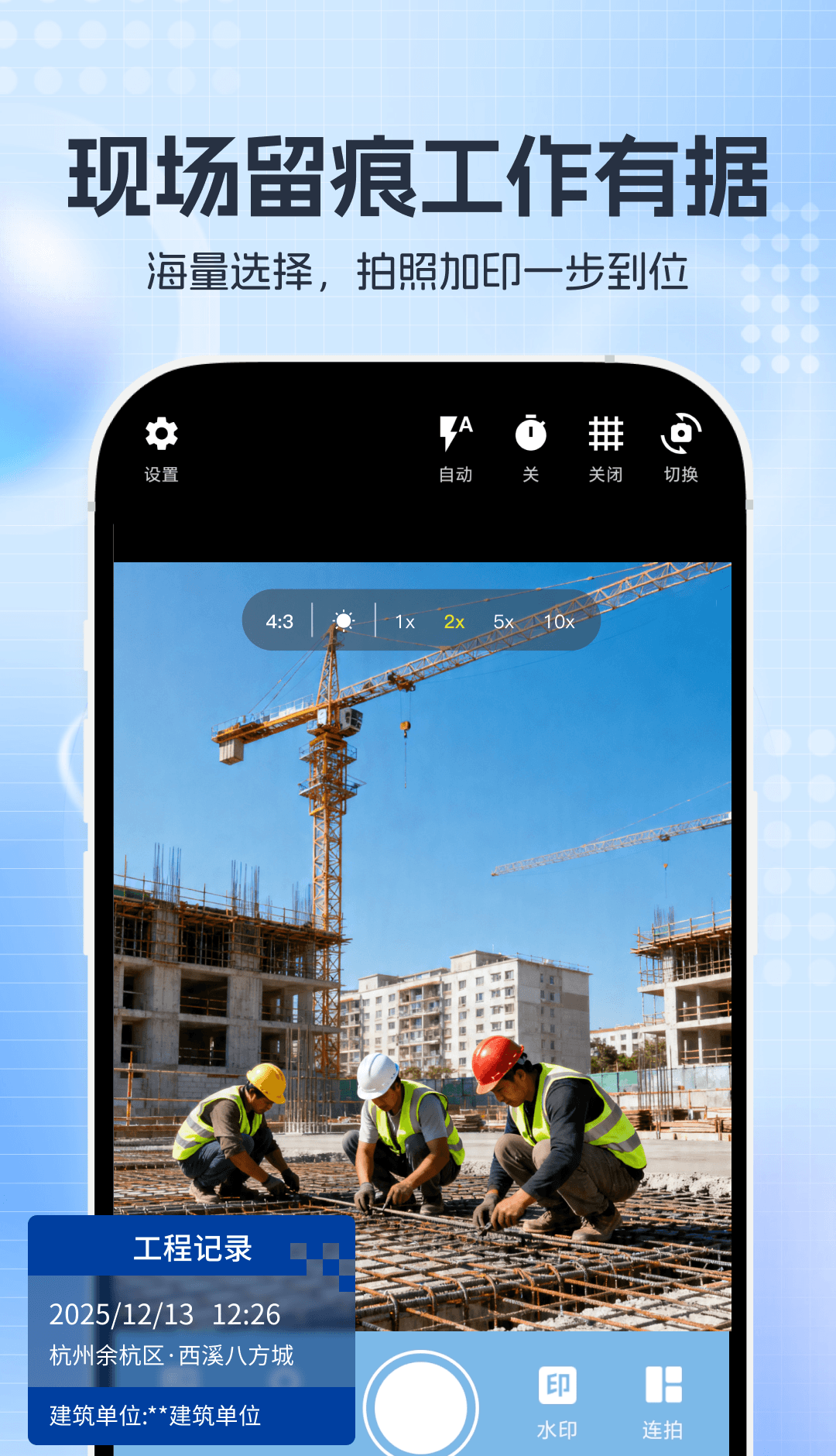 掌上水印相机是一款专业实用的工作水印拍照神器,专为职场办公、外勤打卡、工作记录打造。内置海量精品水印拍照模板,覆盖多行业场景,模板文字支持自定义编辑,可根据自身行业与工作需求,随心修改水印文案,轻松拍出专属工作水印照片。支持自动精准定位,实时获取地理位置并一键嵌入水印,省去手动输入繁琐操作。自带连拍、拼图实用功能,拍摄后快速完成图片拼接,方便整理素材、汇总画面。操作简单上手快,拍照加水印一步到位,满足外勤打卡、工地巡检、商务留痕、日常工作汇报等各类场景需求,高效记录工作瞬间,让办公记录更规范、更省心。
