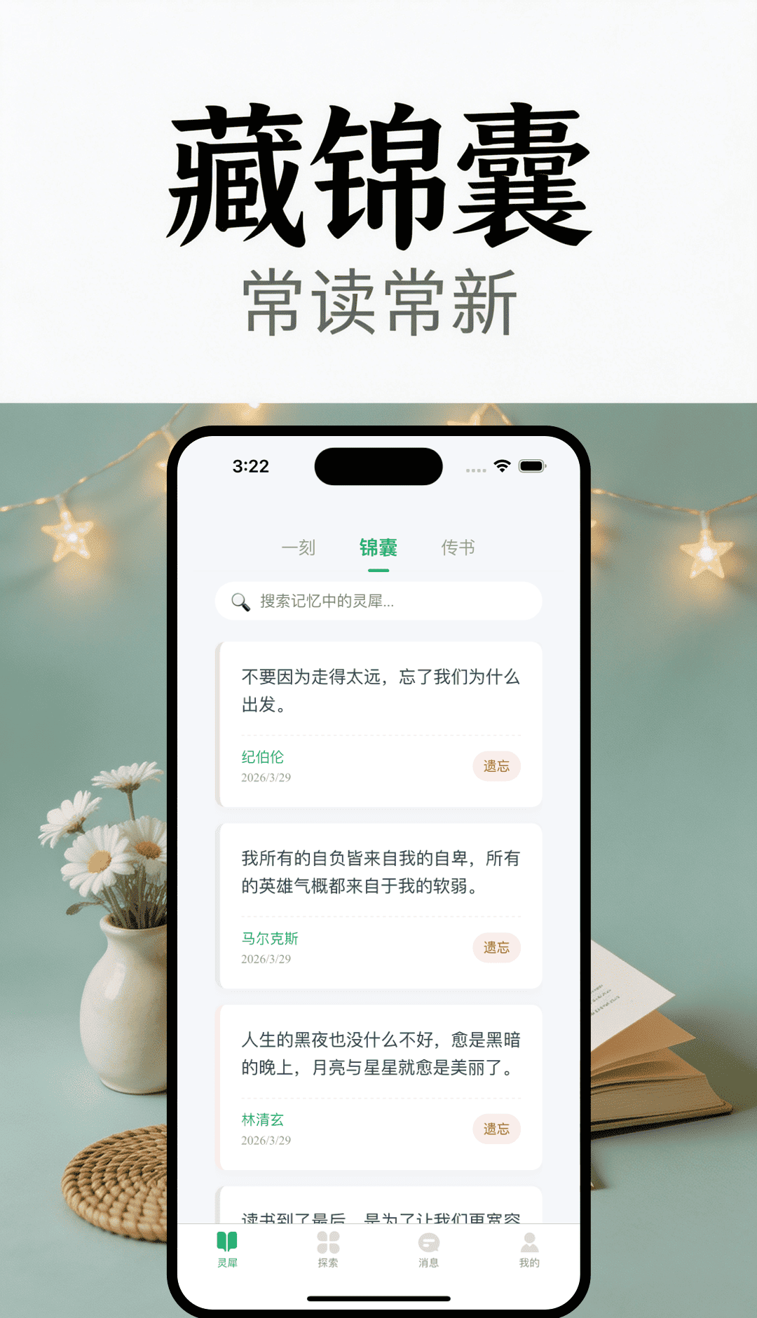灵犀传书是专为文字爱好者设计的灵感收集和管理工具,致力于成为用户的个人文字灵感花园,它集合了国内外经典和当代作品中的好文笔、好句子,让那些感人肺腑的文字不再与你擦肩而过;通过好句子提示功能,用户可以方便地分类收集,随时复习,构建自己的智能图书馆和素材库,在灵犀传书中,你不仅可以从文字中找到答案,还可以在答案中遇见更好版本的自己。为您打造随身携带的文字灵感花园,从国内外文学作品和句子中精选经典和当代作品,让感人肺腑的话语不再错过,好句子小贴士帮你分类收集,随时复习,打造自己专属的智慧库和素材库。