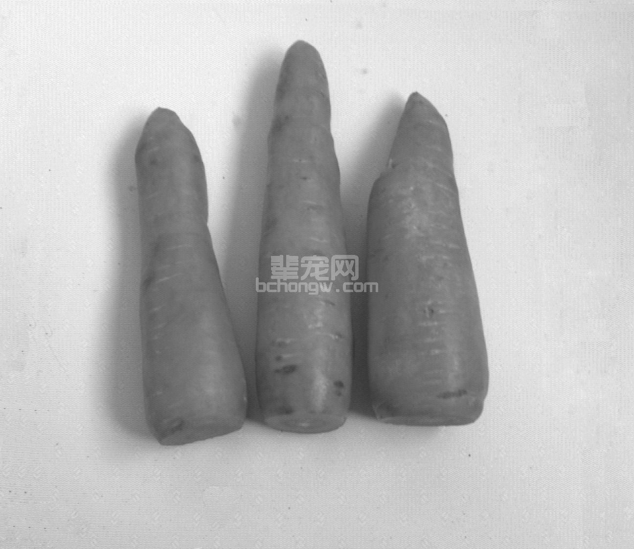 2.多汁饲料:多汁饲料的特点是含水分、糖、淀粉多而蛋白质和纤维素少,富含钾而缺钙、磷。适宜喂兔的多汁饲料有胡萝卜、白萝卜、红薯、西瓜皮、黄瓜、茄子、番茄等。这类饲料幼嫩多汁,有甜味,适口性好。喂种兔有提高公兔精液品质,促进母兔发情受胎,喂哺乳母兔有促进乳汁分泌的作用。但不宜经常连续性喂兔,应与其他饲料搭配饲喂,以避免肚胀拉稀现象(图5.48~图5.51)。