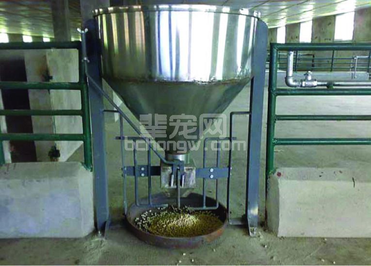 1)料槽料桶:饲槽有方形和圆形自动落料饲槽。自动料桶如图2.1所示,一次可装饲料50~60千克,供40头猪用。料桶安装在隔栏处,距走道隔栏25~40厘米,两栏共用一个料桶。