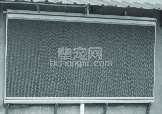 2)水帘:在夏季比较热的地区,在未装风机一端的山墙上,应安装湿帘,用于降低猪舍温度。湿帘高1.2米,宽3米,湿帘下部距地面高80厘米。湿帘可用地下窖池的水循环使用。湿帘墙上部预装一条与湿帘墙长度相同的滴管,用于连接水管;下部建有集水槽,与排水管连接。湿帘如图2.4所示。
