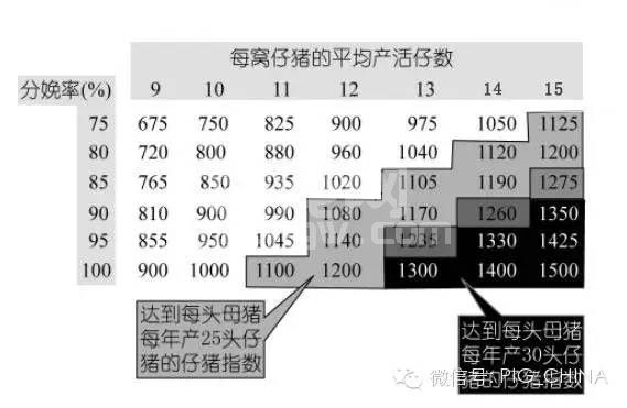以经过25d或28d的哺乳期后的断奶母猪为基准,这些数值可以分别转化为一个至少为950(>20头)或1300(30头)的仔猪指数,这取决于厂房的仔猪死亡率。