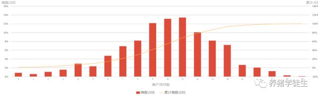 上图图一:是很多农场目前的产仔分布情况,我们可以看到在上图中产仔数低于7头的比例是:21.15%。该场平均产仔数是11.15.如果我们把这21.15%的猪主动淘汰至10%以内,这意味着该场的平均产仔数突破12头。