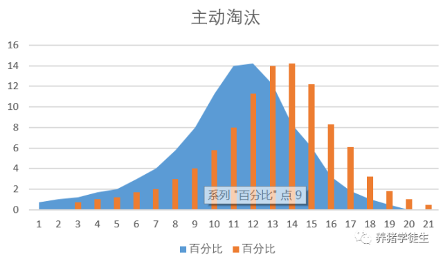 上图是希望让大家更好的理解主动淘汰的重要意义,首先猪场的产仔数是正态分布的,假定目前我们的平均产仔数是12头左右,如果我们把低于2头的那部分母猪淘汰掉,意味着我们可以把产仔数提升至13.5头。
