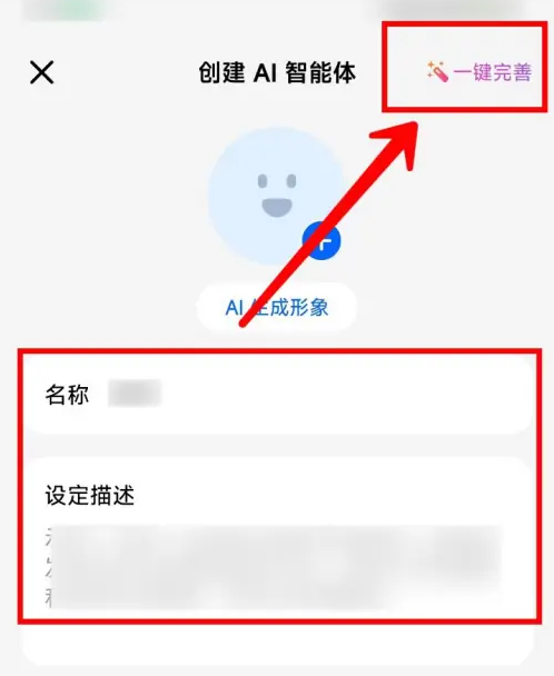 3、打开创建AI智能体页面,输入名称、设定描述以后点击右上角【一键完善】。