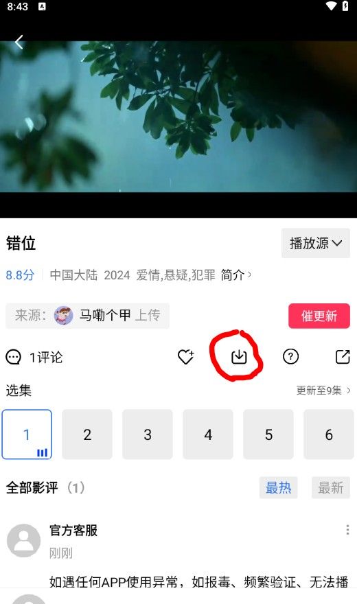 1、还是进入视频播放界面,点击红圈所标注的下载按钮。