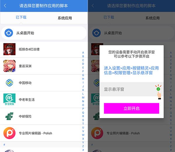 3、选择想要执行脚本的应用,并按照提示打开悬浮窗权限。