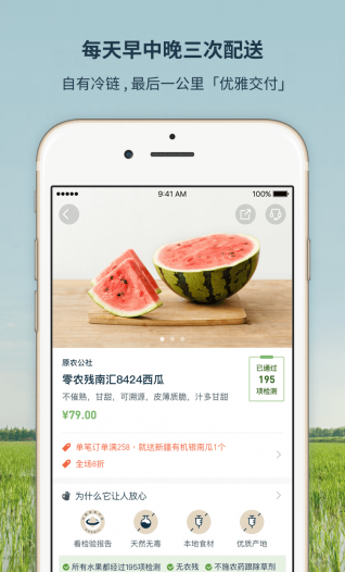 在这里,所有的产品都没有秘密,我们的蔬果合作伙伴大都来自本地自主经营的中小型农场,且顺从四季脉络应时种植,你会看到每样食材的身份证。所有农业或养殖残留,在获CNAS认证的自建实验室和SGS等全球权威的检测机构面前都将无所遁形;专业的检测很贵,但贵不过许下的诺言。