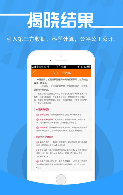3、当一件商品所有“等份”全部售出后计算出“幸运闪购码”,拥有“幸运闪购码”者即可获得此商品。