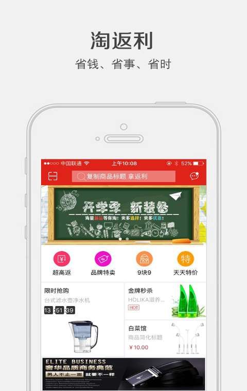 淘返利app淘宝第三方购物平台,精选每日淘宝最优惠的商品,商品由淘宝卖家提供让买家享受超优惠,优质的购物体验,一元秒杀,九块九包邮更能让用户开心抢购!