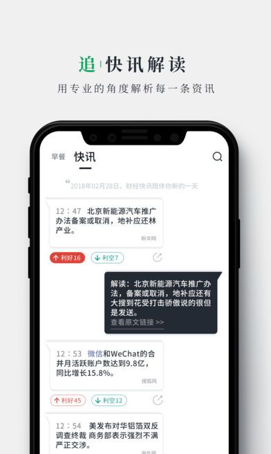 财经早餐app是一款财经新闻手机应用,财经早餐app每天第一时间更新国际金融大事件以及一些投资有关新闻,下载财经早餐app,每天享受最实用的财经新闻。