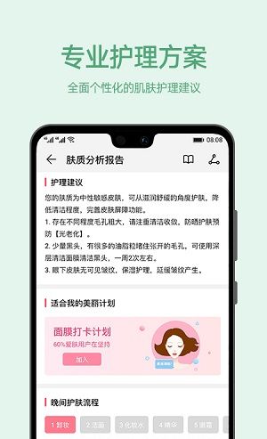 3、爱肌肤app专业护理方案,肤质分析报告更加全面个性化;