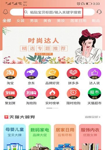 2、在顶部搜索栏粘贴宝贝标题输入关键词,检索对应商品优惠券。